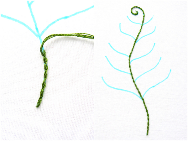 Next, fill in the branches with fern stitch. Starting at the far end of each branch, create a grouping of small stitches. Continue down the branch, increasing the size of the stitches as you go. Don’t worry about making the stitches uniform in shape or perfectly tapering them along the branch. Your fern will be more realistic if the stitches are imperfect, just like a fern frond found in nature.
