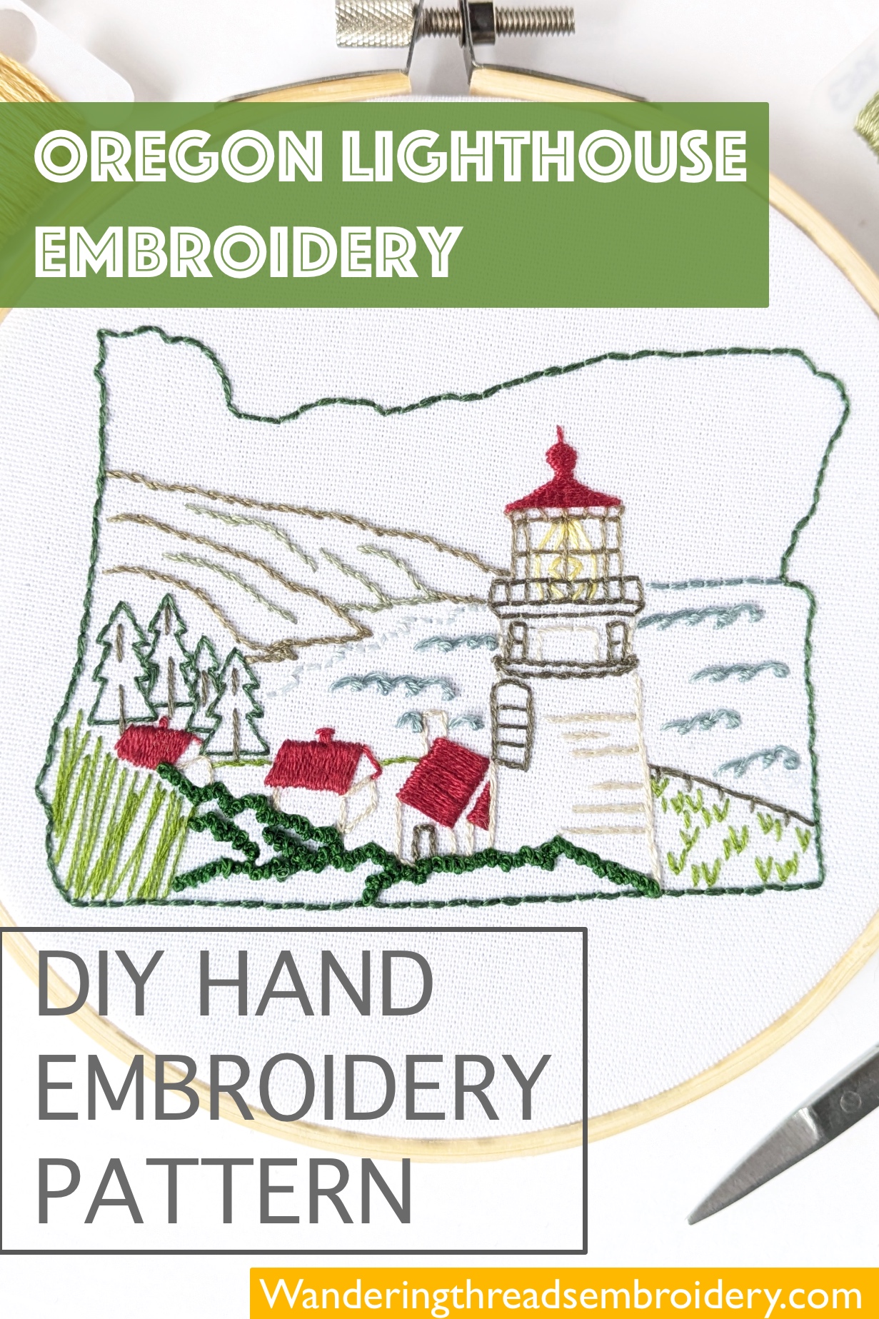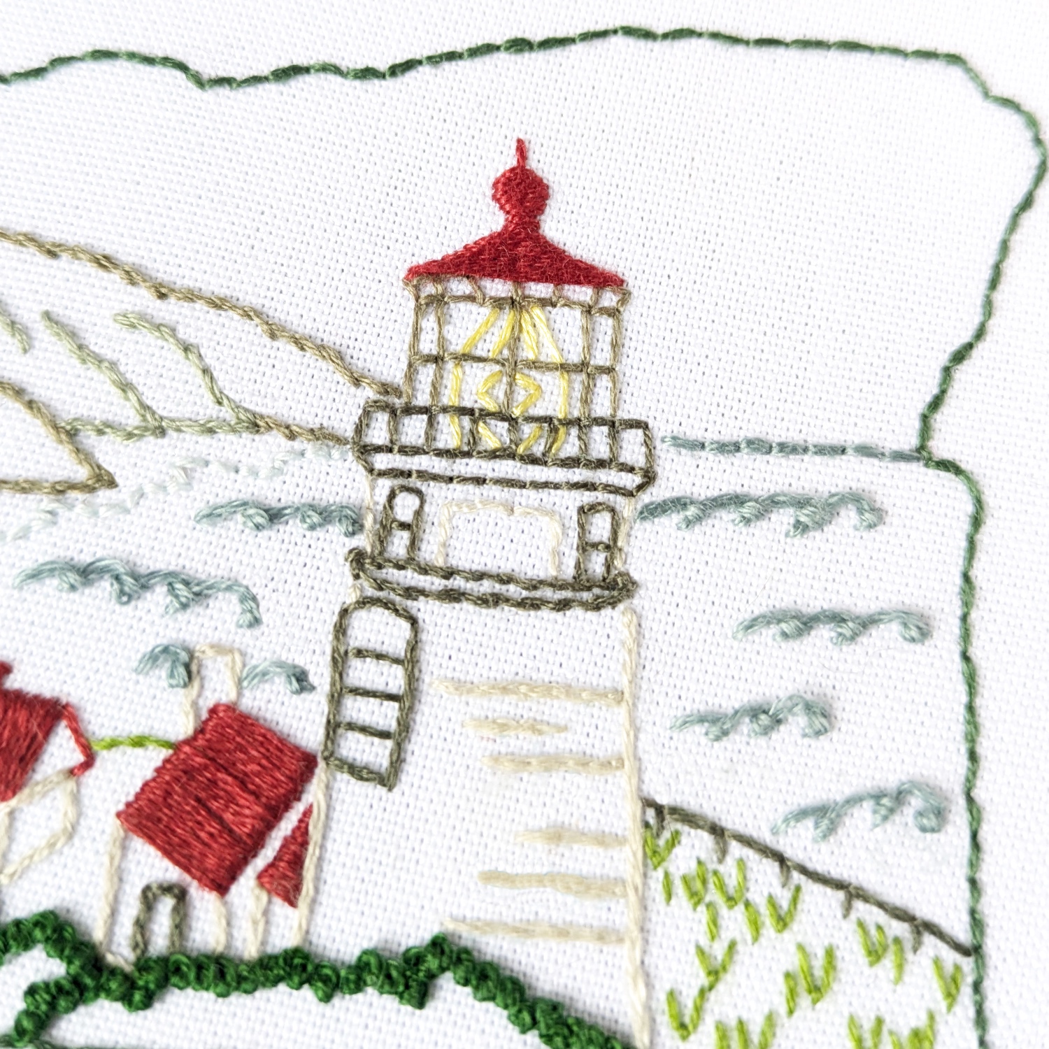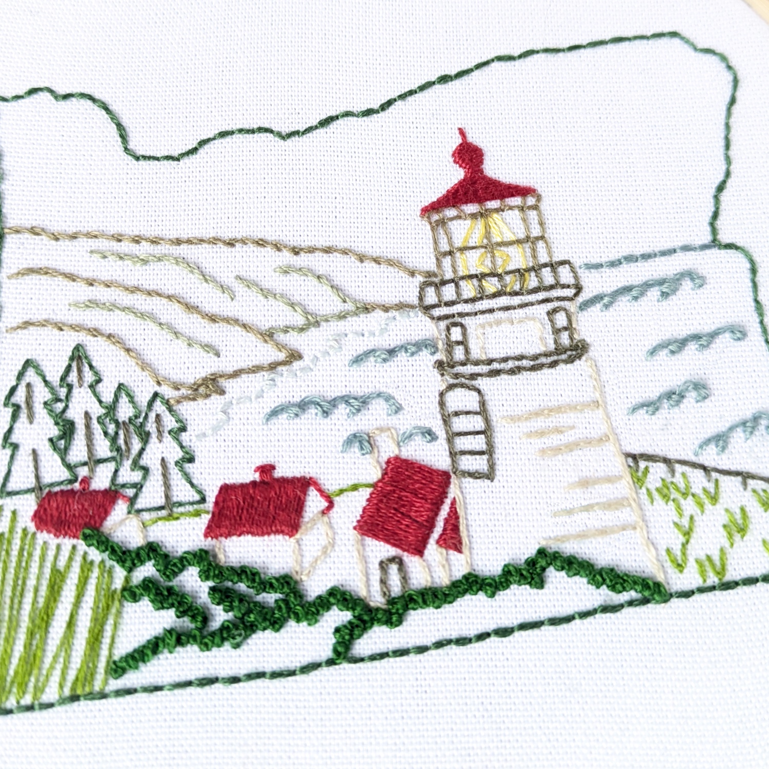 Stitch up an iconic Oregon coast view featuring the Heceta Head Lighthouse. Perched on the bluff overlooking the Pacific, this lighthouse with its cherry red top is visited by thousands every year.