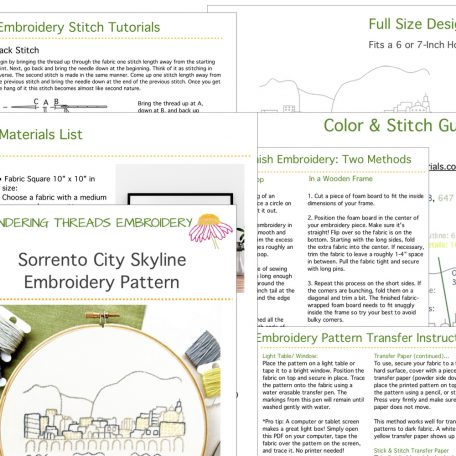 - Illustrated embroidery stitch tutorials + website link for additional tutorials