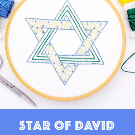 The Star of David pattern features a simple yet detailed double star with contrasting bold lines and delicate curls. This easy pattern uses only four different stitches, three different thread colors, and was designed for all skill levels. A stitch and color guide is included.