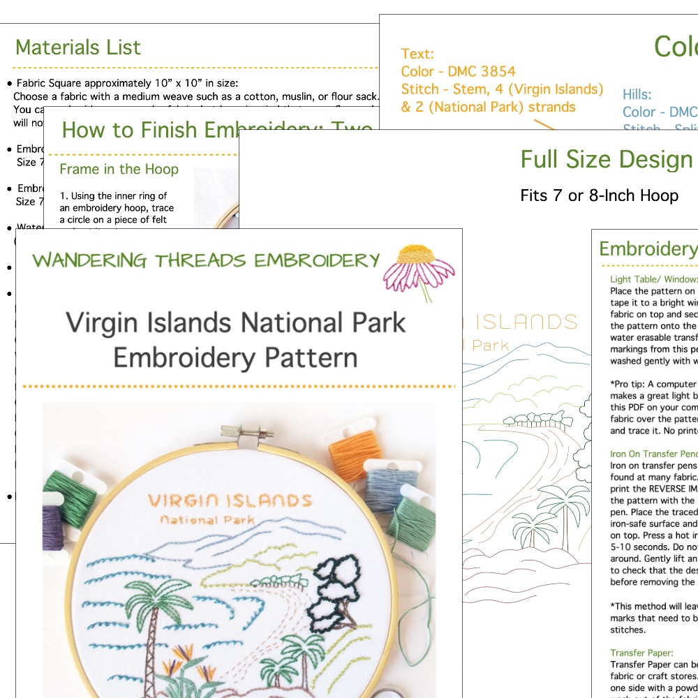 The Virgin Islands National Park is a tropical paradise known for snorkeling, hiking, and sightseeing. This unique hand embroidery pattern features palm trees, turquoise waters, colorful flowers, and a sandy beach. Using only a handful of basic stitches, this pattern is surprisingly simple and is suitable for beginners and experts alike.